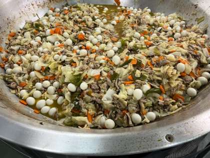 今日の献立の八宝菜は、豚肉、うずら卵、キャベツ、たまねぎ、にんじん、たけのこ、ピーマン、しいたけが入っています。うずら卵を除去した除去食対応献立です。具沢山でとてもおいしい一品でした。