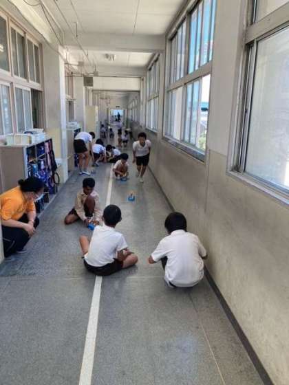 学期末に向けてテストを受けている様子をみることが多い中、4年生が理科の学習で製作した車を走らせていました。