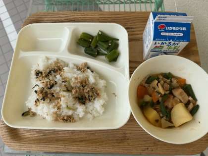 ツナっ葉いためは、ツナとだいこん葉をいため、料理酒としょうゆで味付けしています。こちらもごはんによく合う、とてもおいしい一品でした。