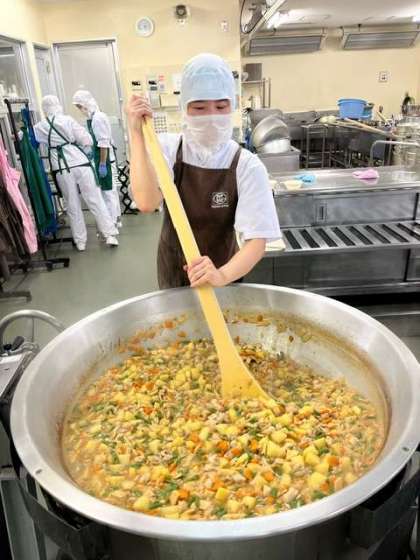 今日の献立の鶏肉と野菜のみそ煮は、鶏肉、じゃがいも、たまねぎ、にんじん、さんどまめ、たけのこ、しいたけが入った煮ものです。赤みその風味がとてもよく、とてもおいしい一品でした。