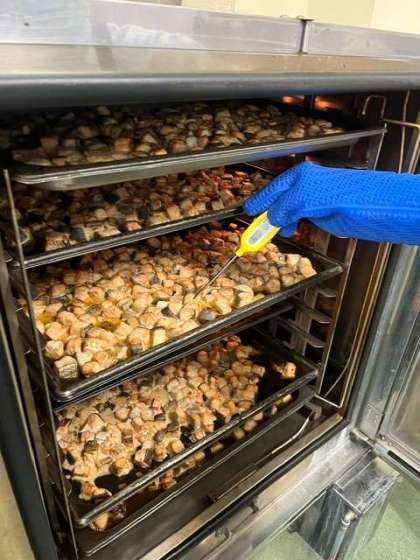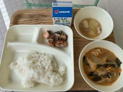 今日の献立のさけのしょうゆ風味焼きは、角切りのさけに料理酒、こいくちしょうゆで下味をつけ、焼物機で焼いています。ごはんによく合うおいしい一品でした。
