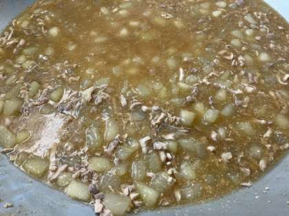 とうがんの煮ものは、夏が旬のとうがんをしょうぎ風味をきかせただしで煮ています。鶏肉と一緒に煮ることで、とても食べやすくおいしい一品になっていました。
