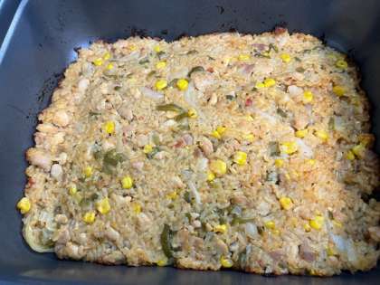 今日の献立のチキンパエリアは、鶏肉、たまねぎ、コーン、ピーマン、トマト缶、にんにくが入ったパエリアです。材料を釜で炒めた後、ミニバットに入れて焼物機で蒸し焼きにしています。カレー粉が入っているので焼き上がる時にはいい香りがしていました。とてもおいしい一品でした。