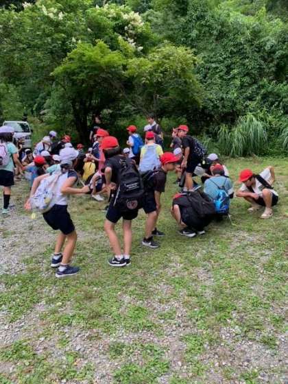 魚つかみに出発です。川にはたくさんの魚がいます。写真で見えますか?