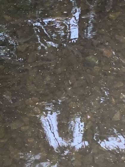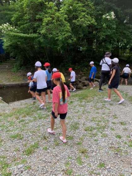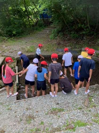 魚つかみが始まりました。冷たい水に入って協力してつかまえます。