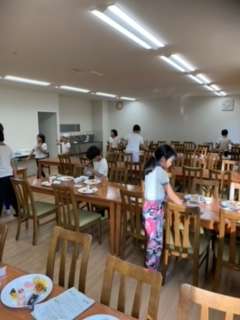 食事係がみんなの分を配膳をしています。美味しそうです。