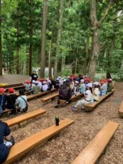 宿舎の前の高原で鬼ごっこやだるまさんが転んだなど様々な遊びをする子どもたち。