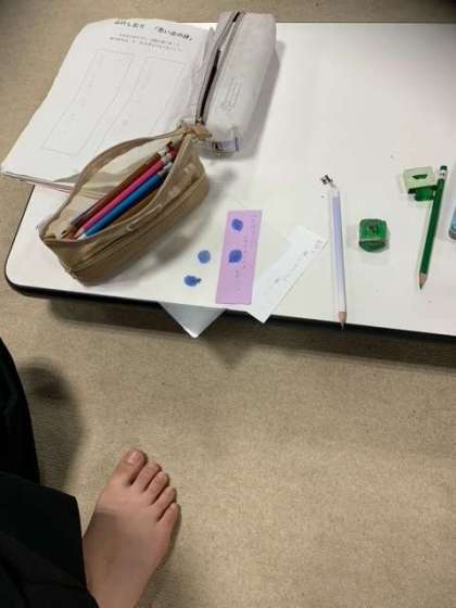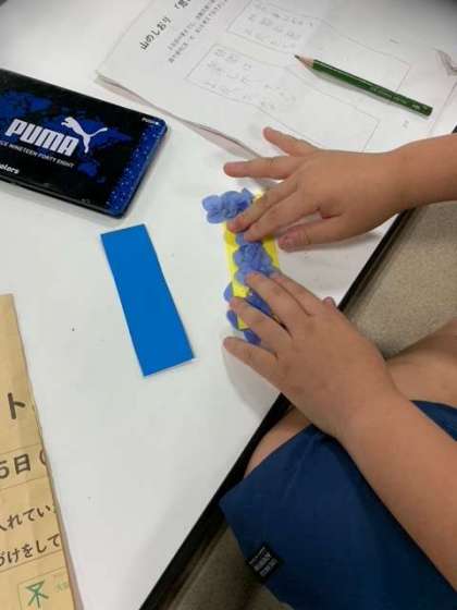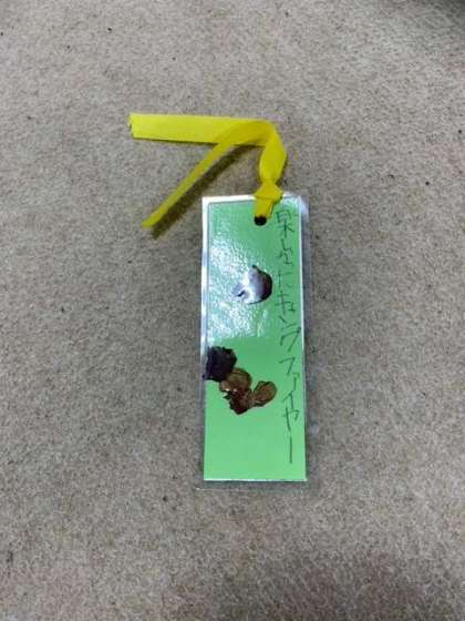 続いての活動はしおりづくりです。昨日、魚つかみをした森やそこまでの道中に咲いていた花や葉っぱなどを押し花にしてしおりにはります。また、林間で感じたことを俳句にして書いてもいます。世界に1つのオリジナルしおりの完成です。