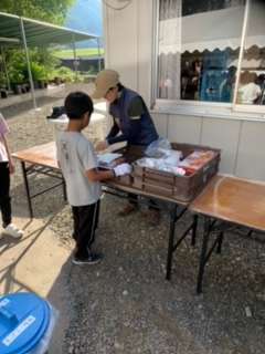 今日の朝ご飯はカートンドッグです。野外で自分でパンを焼いて食べます。