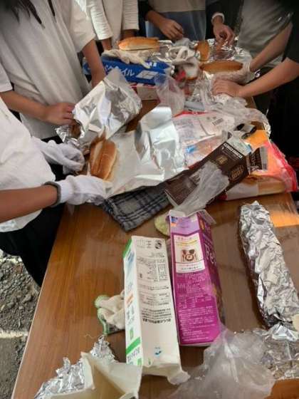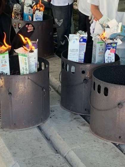 牛乳パックにパンを詰めたらパックに火をつけて焼きあがりを待ちます。
