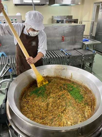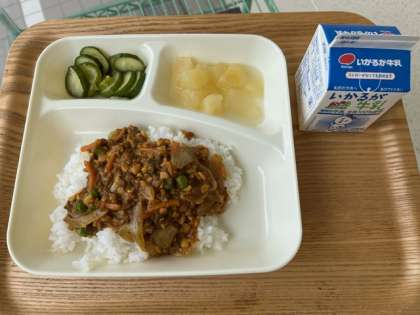 今日の献立の大豆入りキーマカレーライスは、牛ひき肉、豚ひき肉、豚レバーチップ、ひきわり大豆、たまねぎ、にんじん、グリンピース、にんにくが入っています。豚レバーチップには鉄が豊富に含まれています。レバーの臭みはなく、とてもおいしい一品でした。
