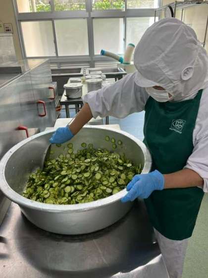 きゅうりのサラダは、焼物機で蒸したきゅうりを、砂糖、塩、ワインビネガー、うすくちしょうゆ、綿実油で作ったドレッシングであえています。さっぱりとしていて、程よい酸味のおいしいサラダでした。