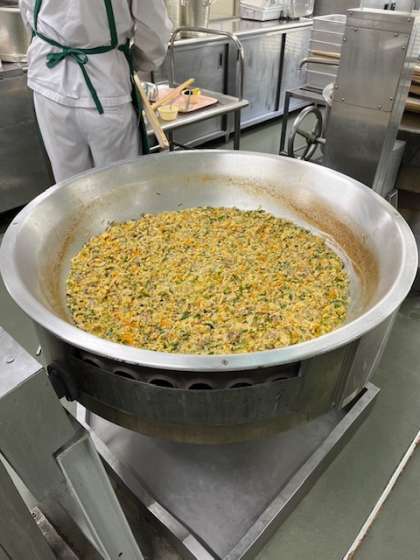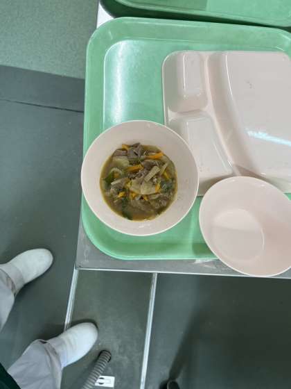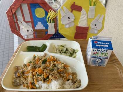 今日の献立の他人丼は、牛肉、鶏卵、たまねぎ、にんじん、青ねぎが入っています。甘辛い味付けで、とてもおいしい一品でした。また、鶏卵を除去した除去食対応の献立でした。鶏卵が食べられない人も安心しておいしく食べることができます。除去食も、とてもおいしく仕上げてくれていました。