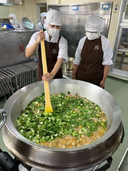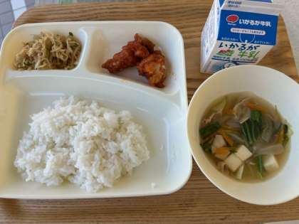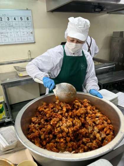 今日の献立のヤンニョムチキンは、韓国・朝鮮の料理です。しょうが汁、にんにく、料理酒で下味をつけた鶏肉に、でんぷんをまぶして油で揚げ、みりん、こいくちしょうゆ、ケチャップ、コチジャンで作ったタレをからませています。とてもおいしい一品で、『めっちゃおいしい!』、『次、いつヤンニョムチキン出るん?』という児童のみなさんの声をたくさん聞くことができました。
