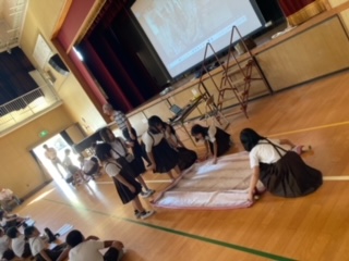 簡易タンカを作って大人を運んだり、トイレの具体的な使い方を聞いたり、避難所にはどのような役割が必要か考えたりしました。
