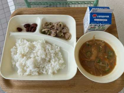 今日の献立のとうがんのみそ汁は、うすあげ、とうがん、オクラ、にんじん、えのきたけが入っています。オクラのねばねばがいい塩梅で、元気の出るみそ汁でした。