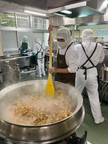 今日の献立の中華煮は、豚肉、あつあげ、はくさい、たまねぎ、にんじん、にらが入った、中華風の煮ものです。赤みその風味が食欲をそそる、とてもおいしい一品でした。
