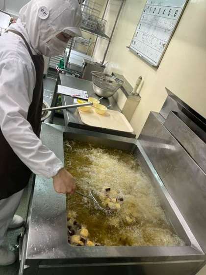 大学いもは、旬のさつまいもを油であげ、砂糖、塩、こいくちしょうゆで作ったみつをからめています。ほっくりと揚がったさつまいもはとてもおいしく、みつの甘みもちょうどいい塩梅でおいしかったです。