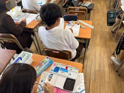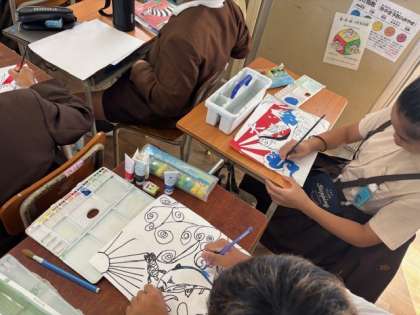 図工では、大漁旗を描いています。運動会でするソーラン節をイメージしながら個性の光る作品を作り上げていきます。