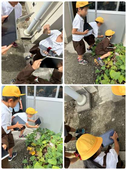 タブレットで写真を撮り、それを見て発見メモを書きました。色や形、大きさ、動き、さわった感じ、聞こえる音に着目して、書くことができました^^
