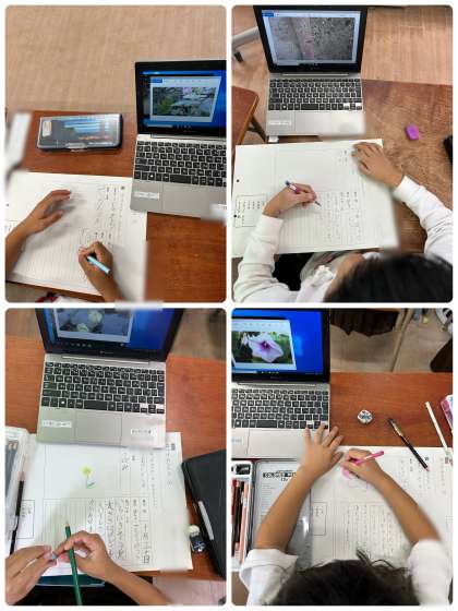 国語科「はっけんしたよ」の学習では、身の回りの花や木、生物などの様子を、細かく観察して、文章に書き、友だちに伝えるようにしています。