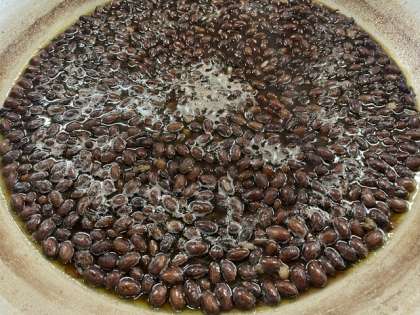 うずら豆のグラッセは、熱湯に浸したうずら豆を、釜で柔らかく煮ています。砂糖、塩、オリーブ油で味付けした、洋風の煮ものです。ふっくらと炊きあがった豆は、とてもおいしい一品でした。