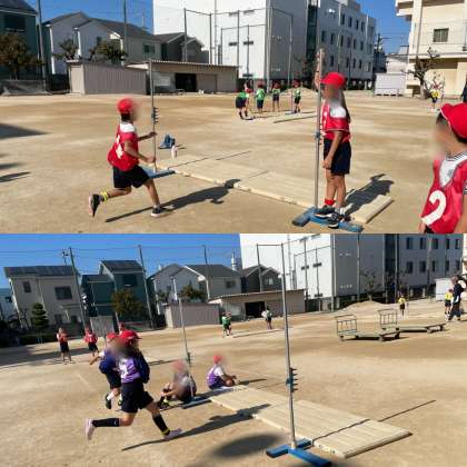 子どもたちは準備や片付けを率先して行い、授業中も積極的に取り組む姿が見られました。チームで記録を測定しながら、何度も挑戦する姿がとても印象的でした。「100センチメートルまであと少し!」と悔しがる子や、「この前飛べなかった90センチメートルをクリアできた!」と喜ぶ子など、それぞれの成長を感じられる時間となりました。