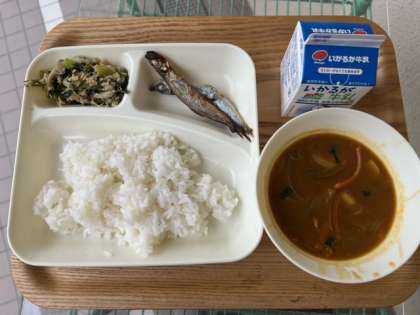 さといもの和風カレー汁は、初登場献立です。豚肉、さといも、たまねぎ、だいこん、にんじん、青ねぎが入った、カレー風味の汁ものです。だしこんぶとけずりぶしでだしをとっているので、だしの風味が感じられる、温かく、おいしい一品でした。