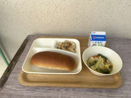今日の献立のきのこのドリアは、ベーコン、たまねぎ、グリンピース、しめじ、エリンギ、マッシュルームが入ったドリアです。クリーム、牛乳、粉末チーズでコクを出しています。