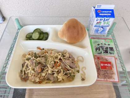 今日の献立の和風焼きそばは、豚肉、キャベツ、たまねぎ、ピーマン、にんじんが入っています。塩、こしょう、うすくちしょうゆ、こいくちしょうゆで味付けしています。喫食時にかつおぶしをかけて食べます。