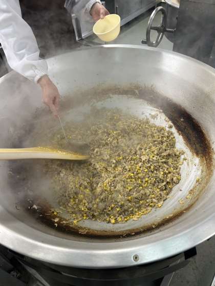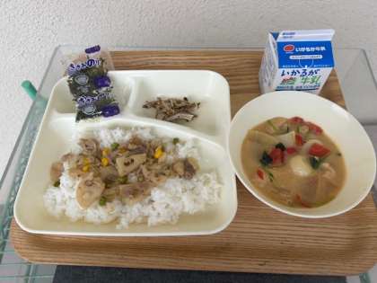れんこんのちらしずしは、豚肉、れんこん、グリンピース、コーン、かんぴょうが入っています。味付けに、粉末のこんぶを使っているので、旨みがしっかりと感じられるまぜごはんです。教室で、ごはんの上にれんこんのちらしずしの具を乗せ、1人1袋のきざみのりをかけて、混ぜて食べます。