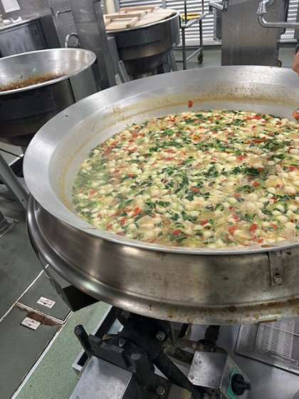 ぞう煮は、かつおぶしでだしをとり、いつものみそ汁よりも白みそを多く使用した、関西風のぞう煮です。鶏肉、白玉もち、さといも、だいこん、なにわの伝統野菜のきんときにんじん、みつばを使っています。