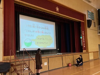 6年生が作成した大阪市の学校給食を紹介するスライドで、最初はスプーンで食べていたことや、ご飯の回数が少しずつ増えたことを知り、驚いていました。