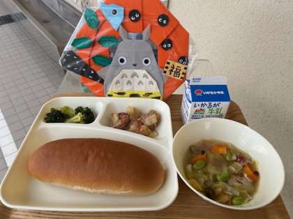 今日の献立の鶏肉とじゃがいものガーリック焼きは、にんにく、こいくちしょうゆ、塩、こしょうで下味をつけた鶏肉に、切ったじゃがいもを混ぜ合わせ、焼物機で焼いています。