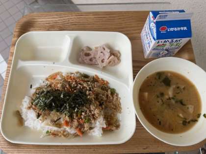 今日の献立の鶏ごぼうごはんは、鶏ひき肉、しょうが、つきこんにゃく、ごぼう、にんじん、グリンピースが入った具を、ごはんにのせ、きざみのりをふりかけて混ぜて食べます。