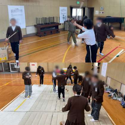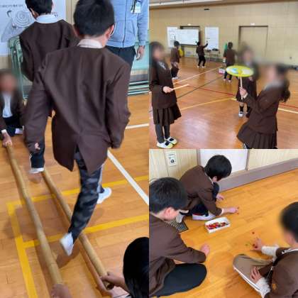 今日3時間目に1組と2組が合同で、「友達の国の遊びをしよう」という活動を行いました。バンブーダンス用の竹や中国ごま、ノルティギ、ペンイ、ユンノリなど、さまざまな国の遊びに挑戦しました。