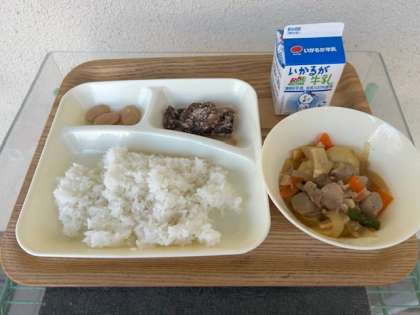 豚肉とじゃがいもの煮ものは、豚肉、じゃがいも、つなこんにゃく、たまねぎ、たけのこ、にんじん、さんどまめが入った煮ものです。けずりぶしでとっただしと、素材の旨みが混ざり合い、とてもいい仕上がりでした。