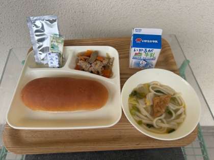 なにわうどんは、うどん、かまぼこ、うすあげ、なくさい、青ねぎが入っています。だしこんぶとけずりぶしでとっただしがよくきいていました。うすあげは、焼物機を使って甘辛く煮ています。