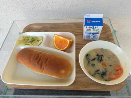 今日の献立の鶏肉とほうれんそうのシチューは、鶏肉、ベーコン、じゃがいも、たまねぎ、にんじん、ほうれんそう、エリンギが入ったホワイトシチューです。乳や小麦粉を使用していないシチュールウの素を使用しています。今日は調理員さんがラッキーにんじんを入れてくれていました。