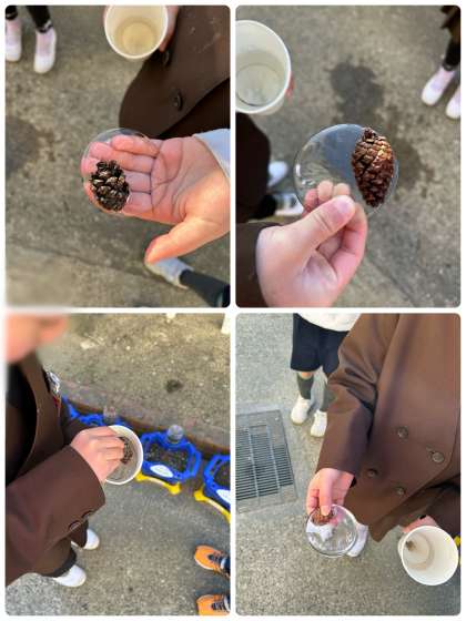 近頃寒い日が続いているため、紙コップに水を入れて学習園においておきました。すると、その水が凍っており、氷になっていました!なかなか、大阪では雪が積もることはありませんが、こういうことも冬ならではの楽しさなのかなと感じました^^