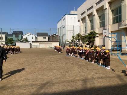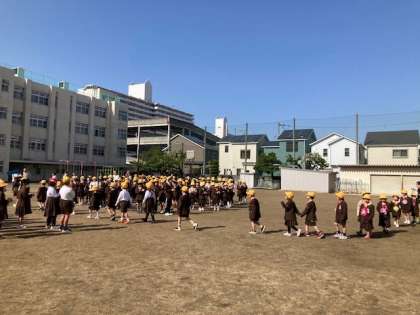 全学年が運動場に集い、1年生を祝う会がありました。