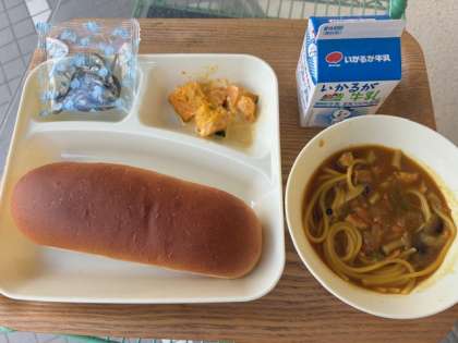 今日の献立のカレースープスパゲッティは、鶏肉、ベーコン、たまねぎ、にんじん、ピーマン、しめじが入ったカレー味のスープスパゲッティです。カレーの香りがよく、具材にとても合っていて、おいしい一品でした。