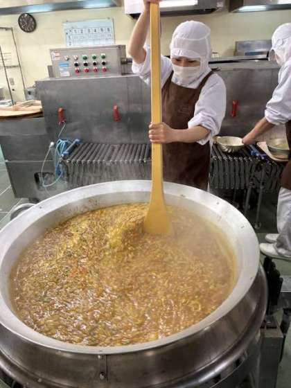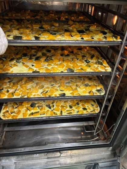 かぼちゃのマリネ焼きは、新献立になります。かぼちゃに野菜ブイヨン、ノンエッグドレッシングで下味をつけ、焼物機で焼いています。新しい献立ですが、しっかり食べてくれるといいな、と思います。