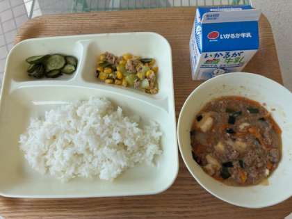 今日の献立のマーボーどうふは、牛ひき肉、豚ひき肉、とうふ、たまねぎ、にんじん、にら、しょうが、にんにくが入っています。味付けに赤みそとこいくちしょうゆ、そして少量のトウバンジャンが旨みを出していました。