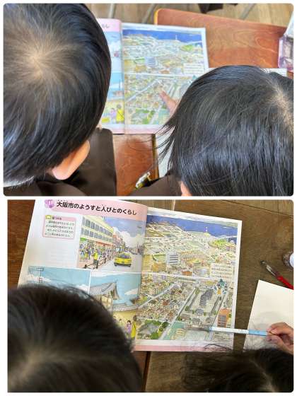 3年生から社会の学習も始まりました!社会は「大阪市のようすと人びとのくらし」を学習しています。教科書に載っている絵を見て、気づいたことについて話し合いました。また、自分たちのまちと比べ、似ているところや違うところについて考えました。似ているところは「家が多い。」や「道路がたくさんある。」で、違うところは「海がある。」など、自分たちの住んでいるところの様子についても考えることができました。