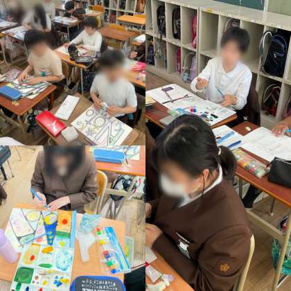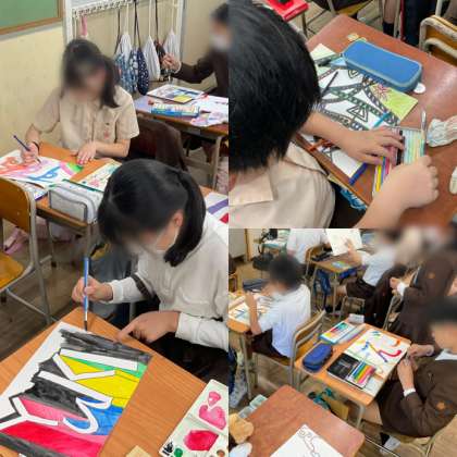 図画工作の授業では、「名前でアート」に取り組んでいます。自分の名前をテーマに、漢字・ローマ字・ひらがなの中から一つを選び、画用紙に表現しました。大きな部分は絵の具で、細かい部分は色鉛筆で丁寧に色を塗り、筆の使い方を工夫しながら取り組んでいました。自分らしさのあふれる、個性豊かな作品が仕上がっています。
