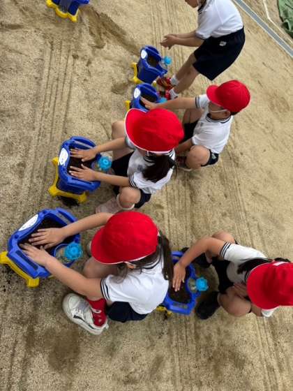 今日は、ふかふかの土の上にあさがおのたねを植えました。