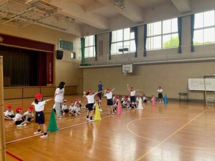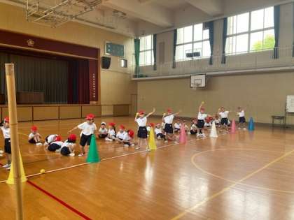1年生は、腕の位置に気をつけながら、ボールを投げていました。