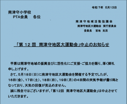 18日(日曜日)に予定されていた大運動会は、天候不良が予想されるため中止が決定いたしました。ご理解の程、よろしくお願いします。