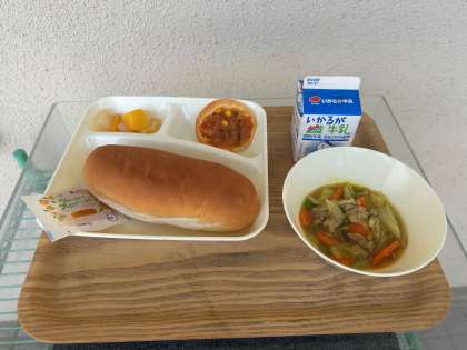 今日の献立は、豚肉と野菜のカレースープ煮、変わりピザ、ミックスフルーツの缶詰でした。給食のピザはミニサイズのため、餃子の皮を使用していて、パリッとした食感の一品となっていて、パンにはさんでも絶品の味でした。給食委員会の児童が「イタリアでの本場の呼び名」を1,パッツア2,ピッツア3,プッツア の三択で全校に向けてクイズを出してくれていました。笑。